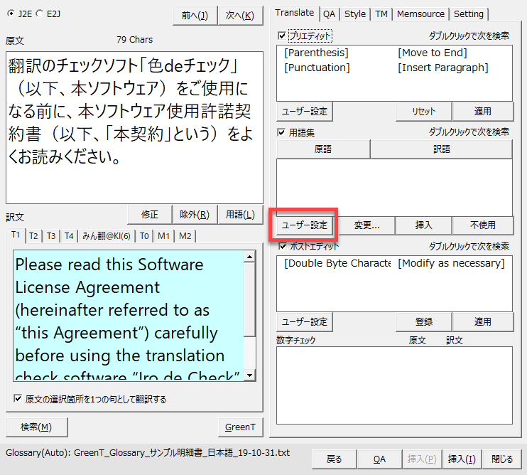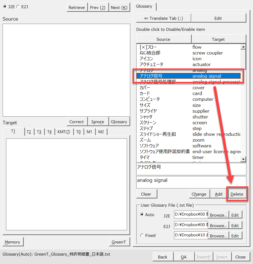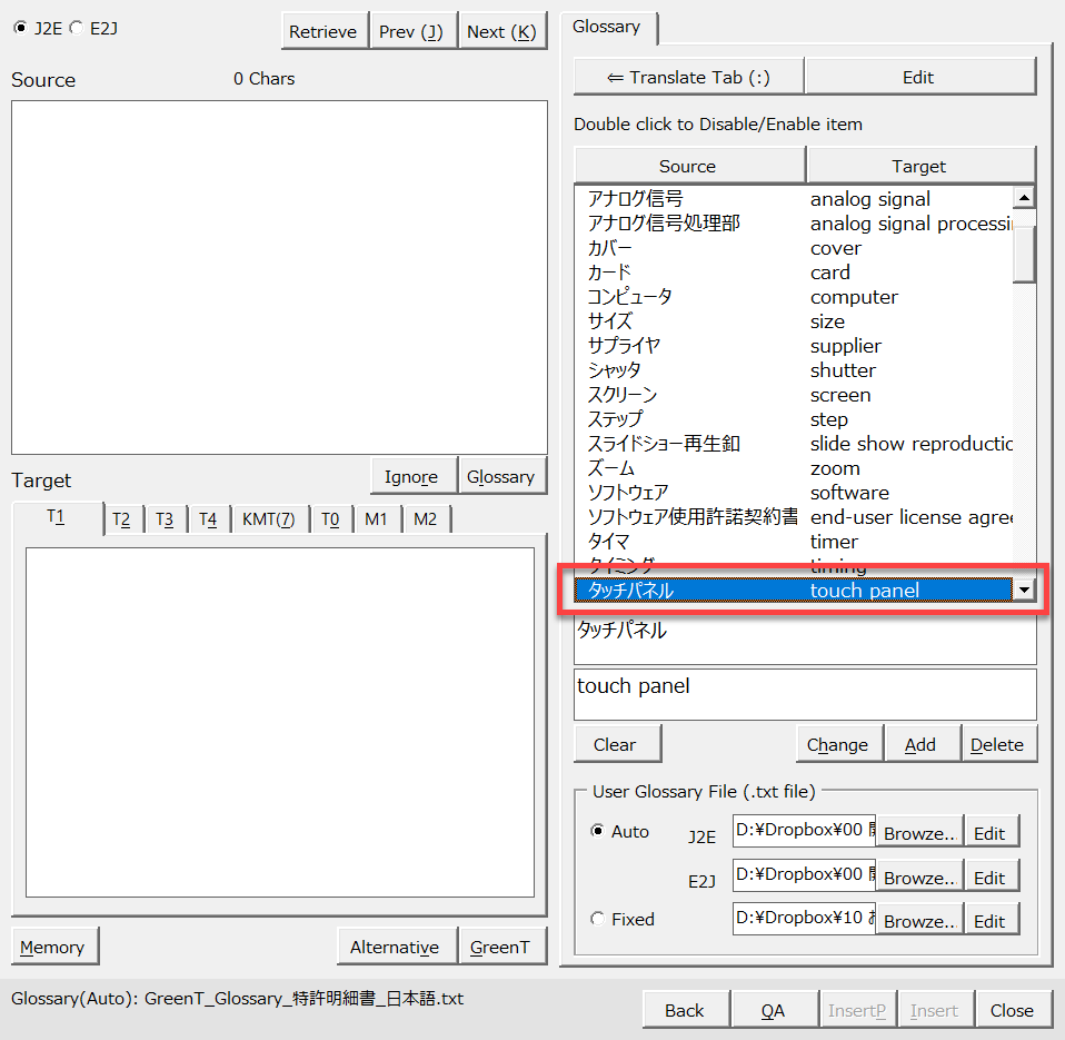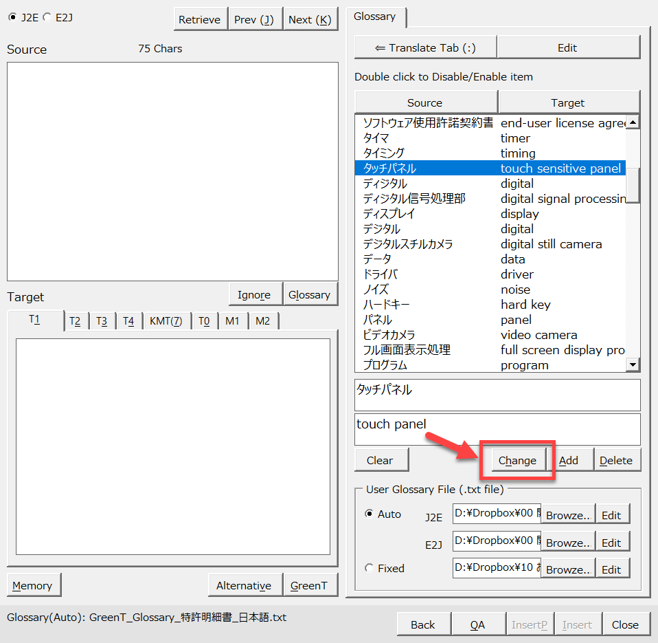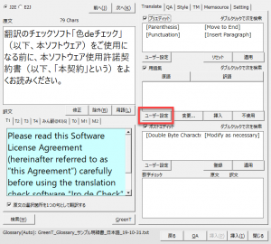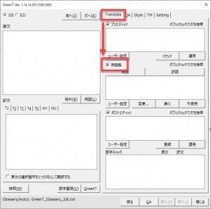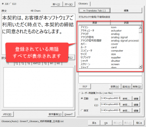 その後に、Source欄の原語(色deチェック)を選択してから[用語]ボタンをクリックします。