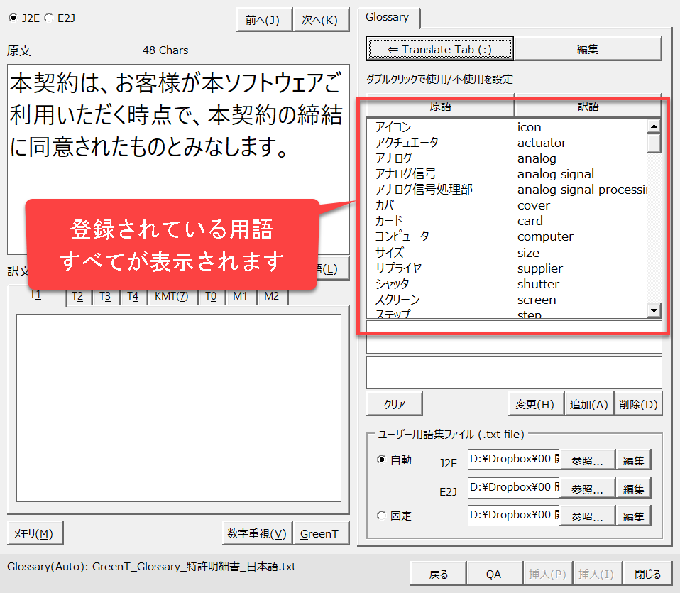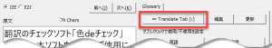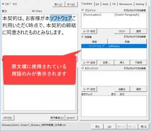 [Translate]タブの[用語集]リスト([Glossary]リスト)には、現在、[原文]欄([Source]欄)に表示されている原文で使われている用語のみが表示されます。