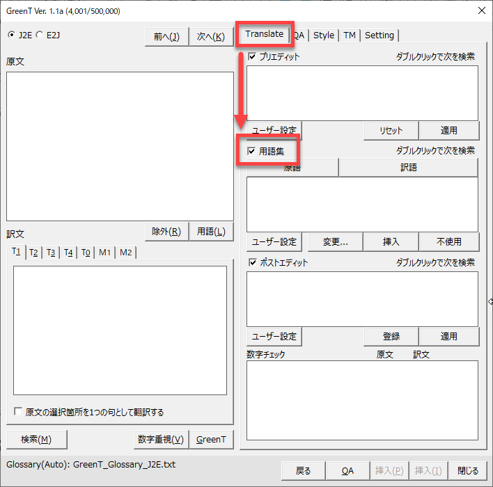 翻訳で用語集を適用するには、以下のように[用語集]チェックをオンにしてください。