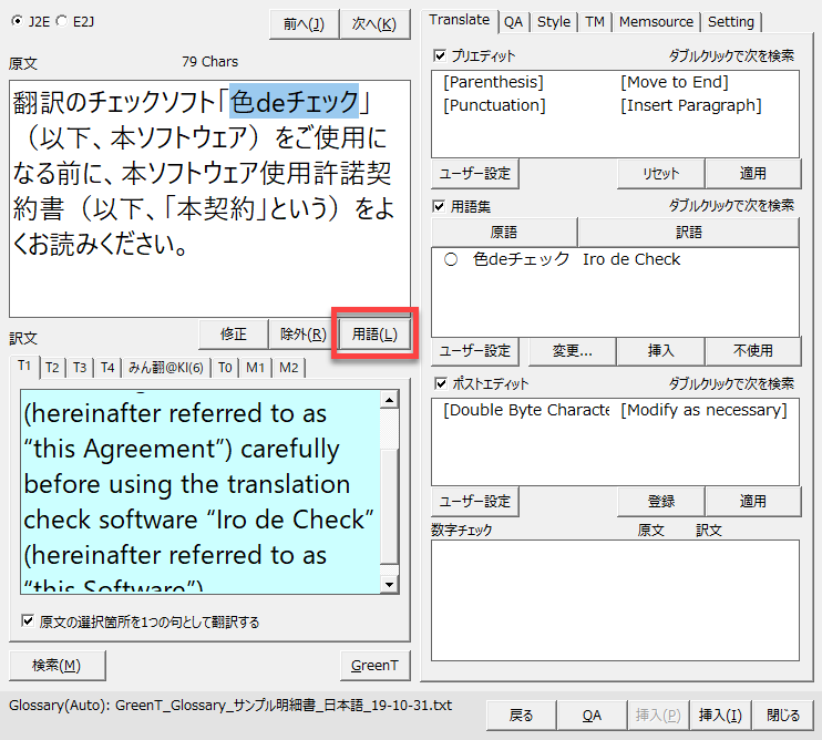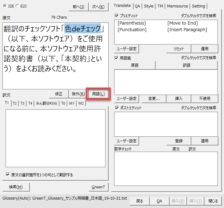 訳文の出力前に登録する場合には、原語を選択して[用語]ボタンをクリックします。