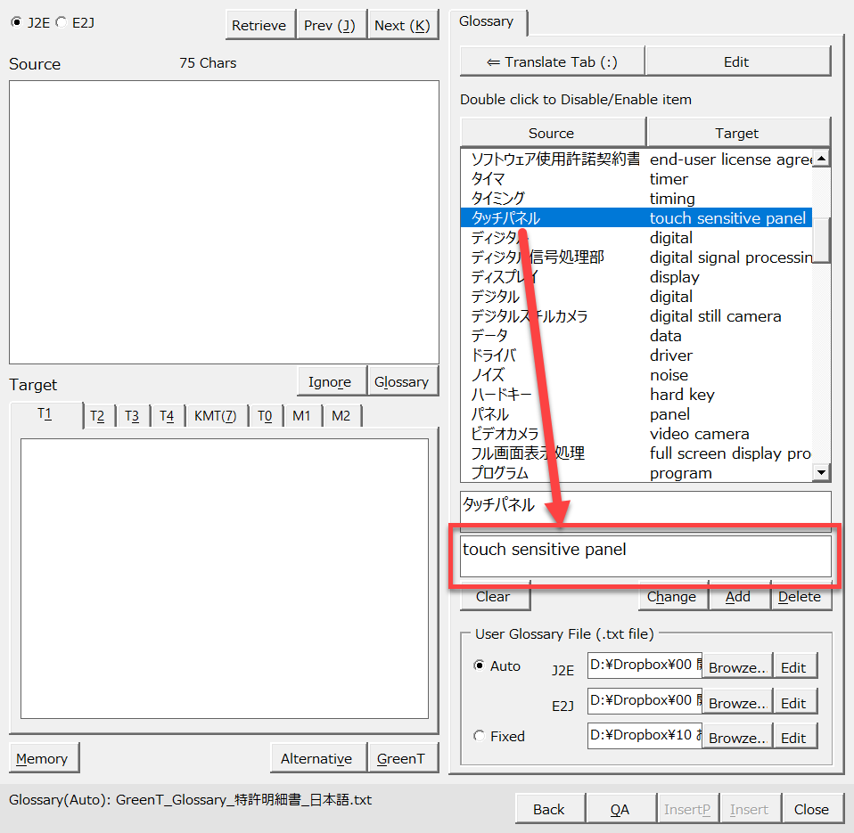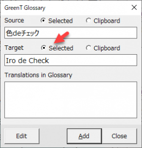 Targetの訳語の項目に[Selected]を選択すると、Target欄で選択されていた言葉が入力されます。