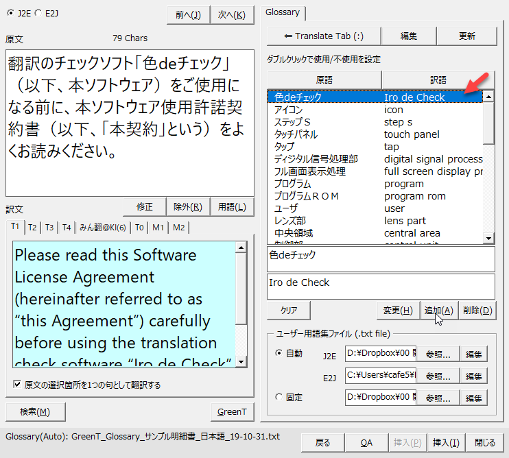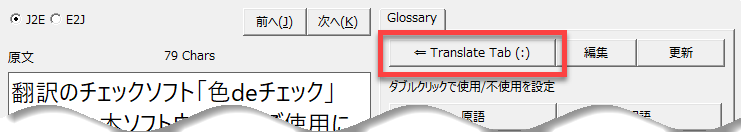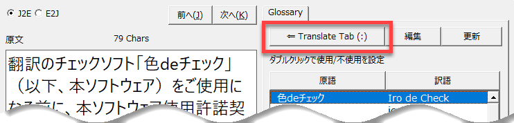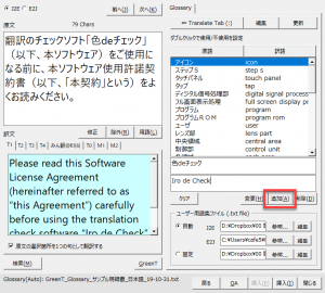 翻訳中に随時登録できます。「色deチェック」に訳語「Iro de Check」を登録する場合を説明します。
