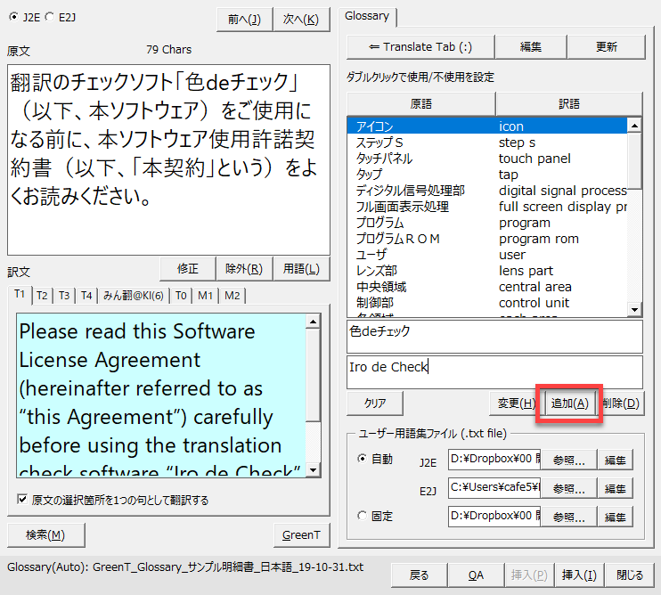 原語と訳語を入力後に[Add]ボタンをクリックして登録します。