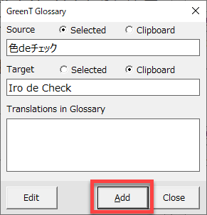 Targe欄に訳語を入力して、[Add]ボタンをクリックして登録します。
