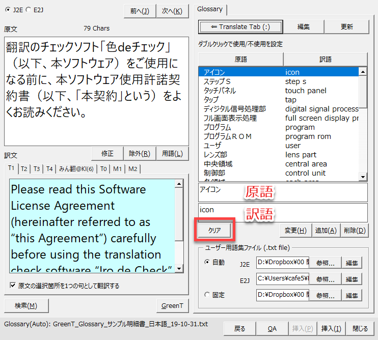 原語と訳語を記入します。空欄になっていない場合には、[Clear]ボタンをクリックしてください。