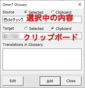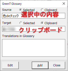 登録用のダイアログが表示されます。原語(選択中の文字列)がSource欄に自動的に入力されます。Target欄(訳語欄)には、現在のクリップボードの内容が入力されます。デフォルトの設定では、Targetに[Clipboard]が選択されているからです。