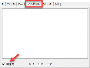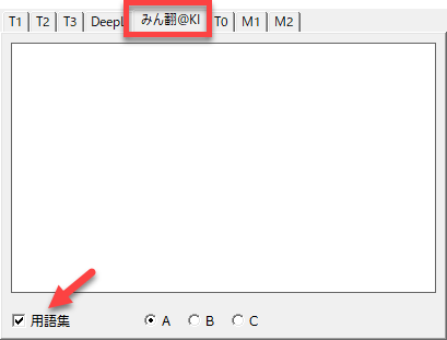 以下のチェックをオンにするとGreenTの用語集を適用できます。用語集の適用ルールをA~Cの3種類から選んで試してください。分野により適用結果が変わります。