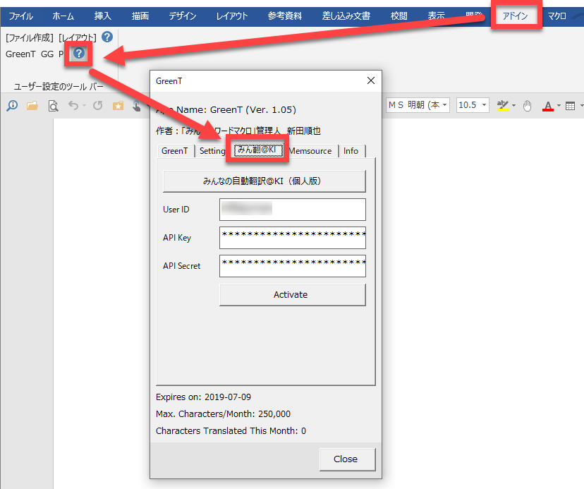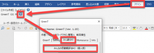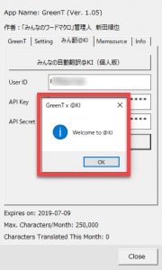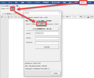 入手したユーザーID、APIキー、APIシークレットを、GreenTのヘルプダイアログの以下のタブで対象項目に入力します。