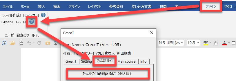 [アドイン]タブの[GreenT]ボタンからGreenTを起動すると、以下のように「みんなの自動翻訳@KI(個人版)」用の翻訳タブが表示されます。