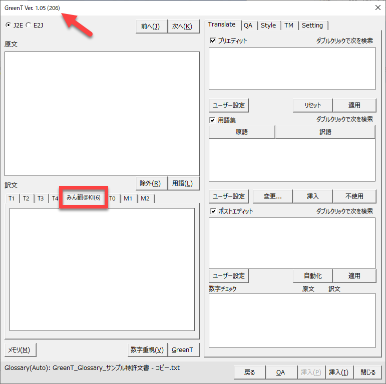 GreenTのユーザーインターフェイス上では、「みんなの自動翻訳@KI(個人版)」用の翻訳タブを選択すると、「みんなの自動翻訳@KI(個人版)」エンジン利用量(GreenTでの月間利用文字数)をタイトルバーに表示します。
