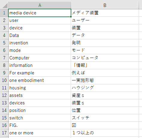 この用語集から今回の案件で用いられている用語を抽出してExcelファイルにまとめて翻訳者に提供します。