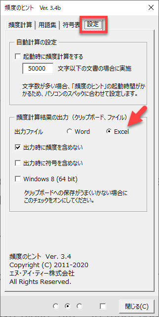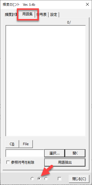 まずは、表示設定用のラジオボタンの中央を選択して、頻度計算のダイアログを開き[用語集]タブを選択します。