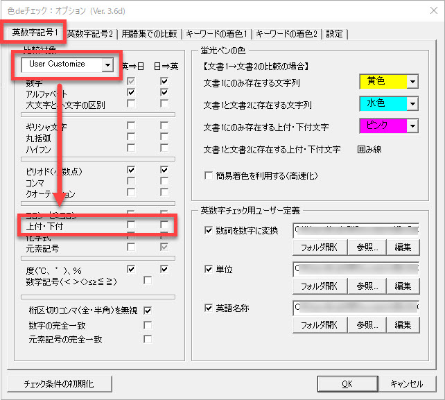 チェックのオプションダイアログにて、以下のタブで[User Customize]を選択して上付・下付の項目をオフにしてください。これでチェック対象から外れます。