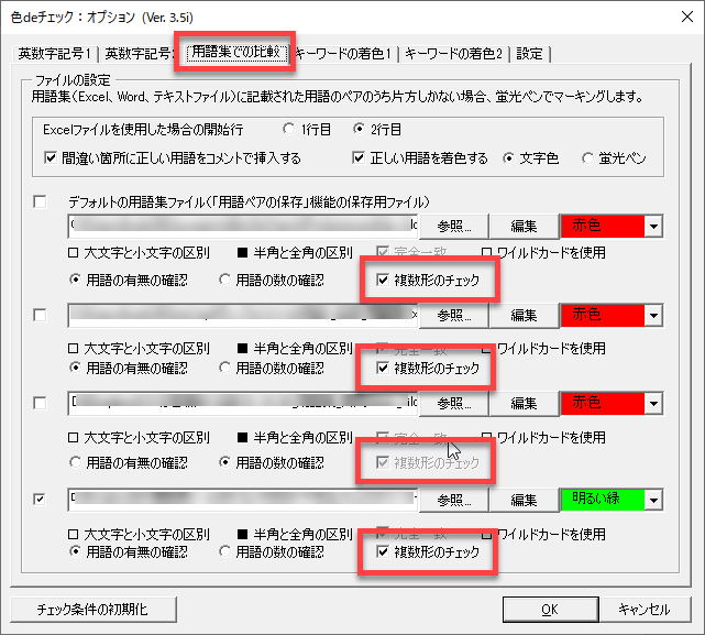 チェックのオプションダイアログで、以下のチェックをオンにしてください。用語の数を確認する場合には、自動的に複数形のチェックがオンになります。