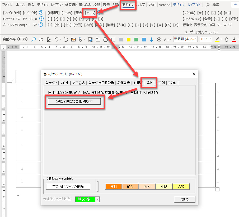 表内の結合セルの有無を確認する機能があるので、以下の方法で確認してみてください。ただし、この機能は2列の対訳表でのみ機能します。ご注意ください。