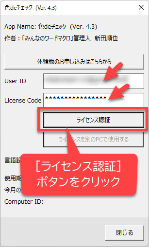 [ライセンス]ボタンをクリックして以下のダイアログを開き、User IDとLicense Codeを入力して[ライセンス認証]ボタンをクリックしてください。
