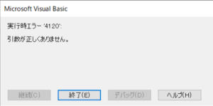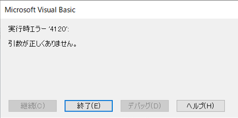 - 「実行時エラー'4120': 引数が正しくありません。」が表示されます。
