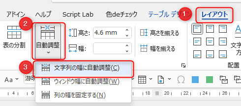 列と列の間の罫線をダブルクリックするとずれていた列幅がそろう場合があります。もしくは、[レイアウト]タブの[文字列の幅に自動調整]ボタンをクリックしてください。