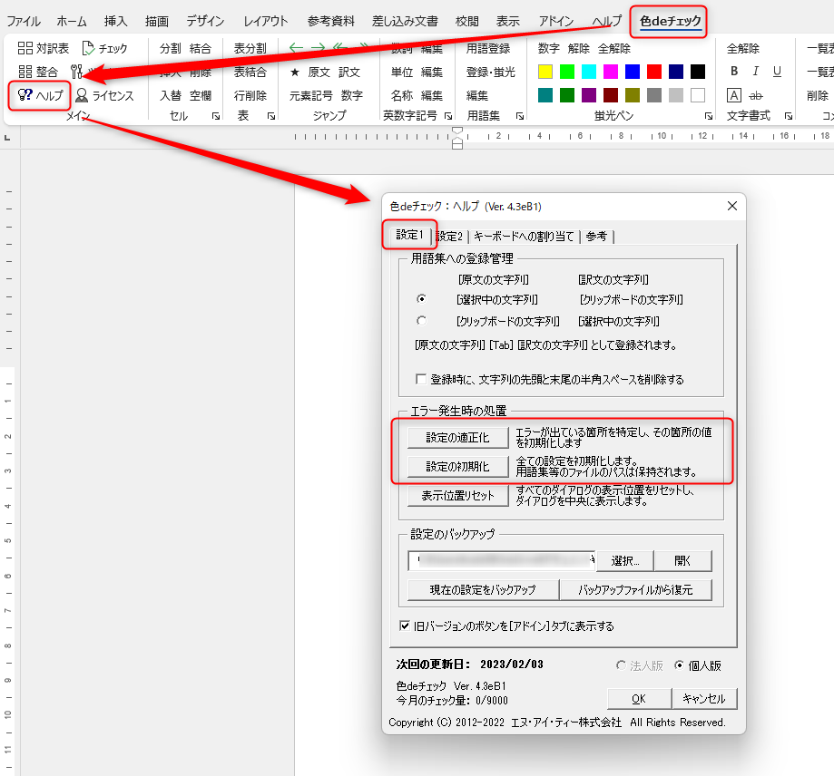 まずは、[ヘルプ]ダイアログの[設定の適正化]ボタンをクリックして様子をご確認ください。これでもエラーが起こる場合には、[設定の初期化]ボタンをクリックしてください。