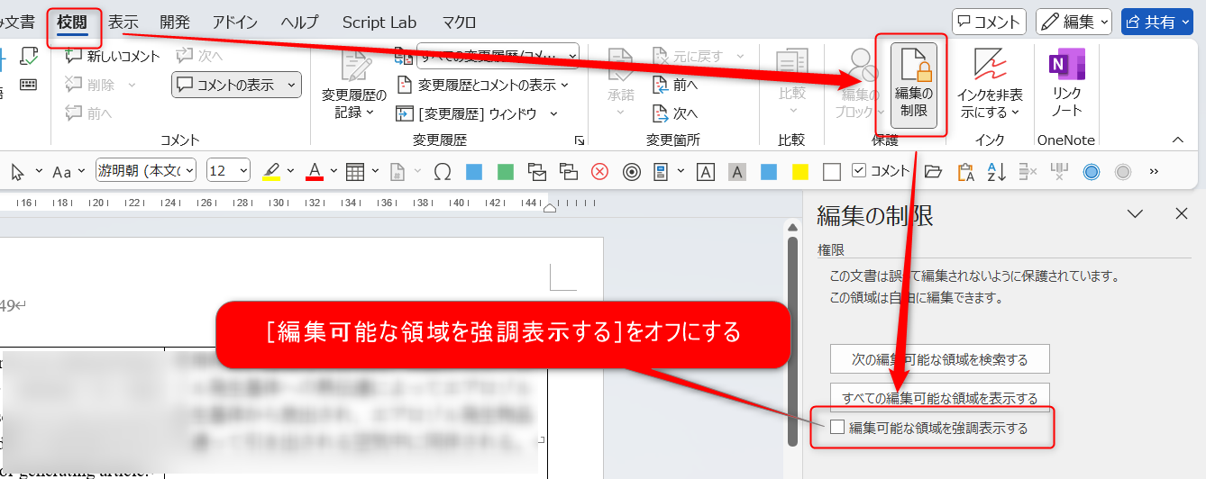 強調表示を解除する場合は、[校閲]タブの[保護]グループの[編集制限]ボタンをクリックします。[編集の制限]ウィンドウが表示されるので[編集可能な領域を強調表示する]をオフにしてください。通常の表示になり、蛍光ペンが表示されます。