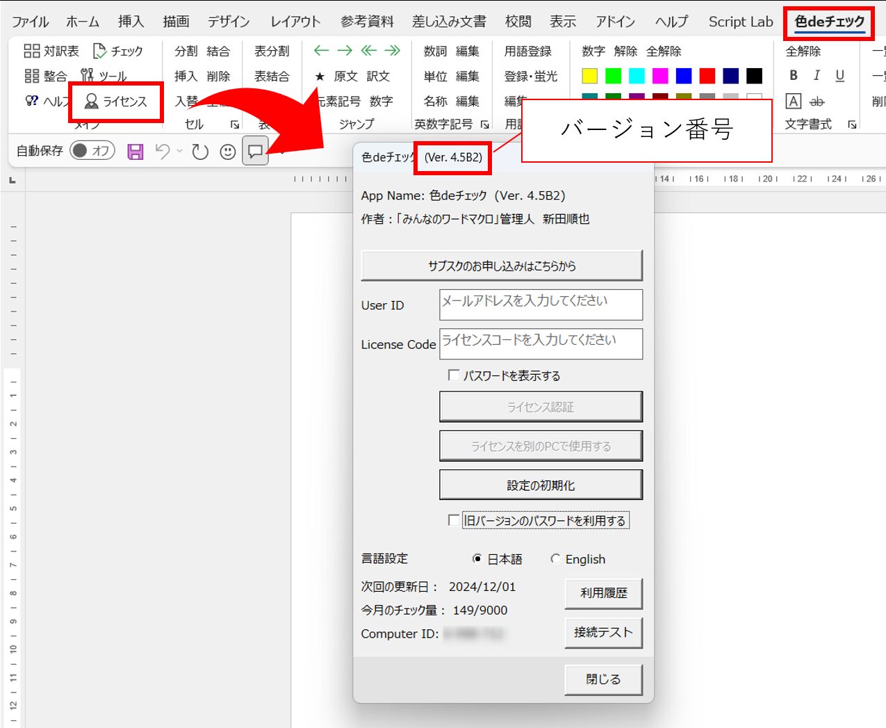 [色deチェック]タブの[ライセンス]ボタンをクリックしてライセンスの認証用ダイアログを開いてください。タイトルバーにバージョン番号が記載されています。