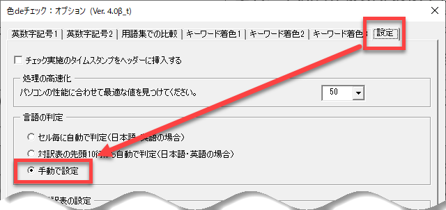 そこで、ユーザーさんに原文と訳文のいずれが2バイト文字(タイ語など)なのかを選択してもらいます。