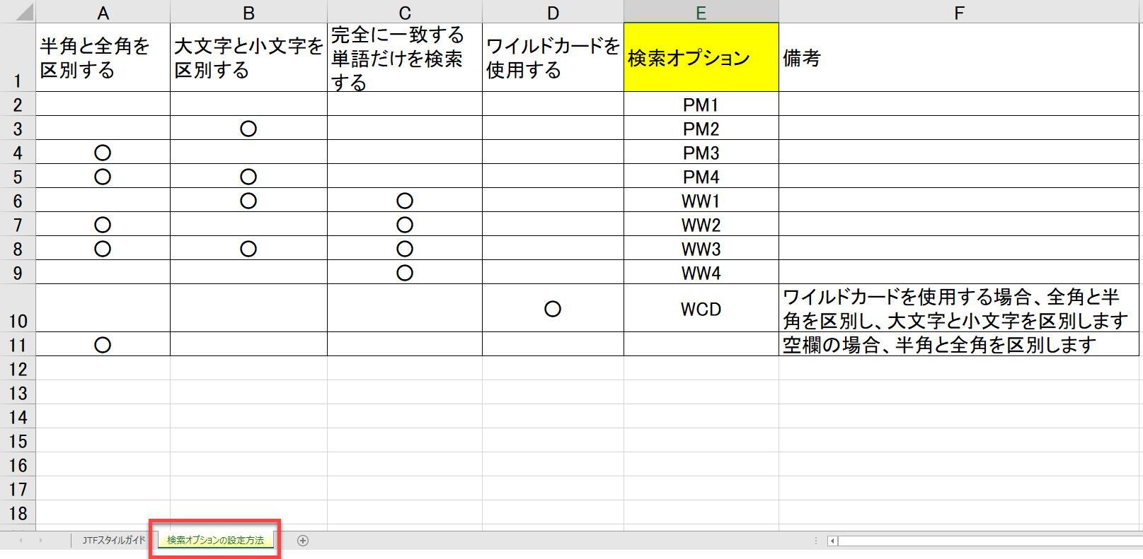 2シート目の「検索オプションの設定方法」を開くと、検索オプションで用いられている記号(PM1、PM2など)の意味の説明が表示されます。
