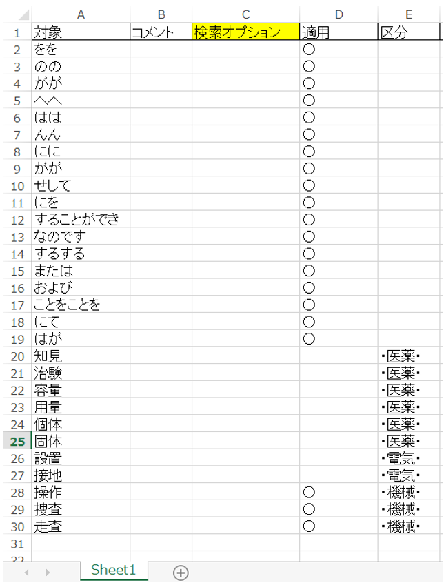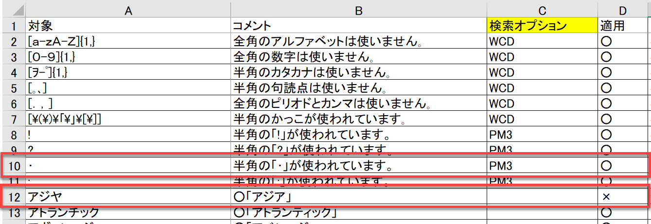 また、12行目の「アジヤ」については、D列が「×」になっているので検索をしません。ちなみに、12行目には検索オプションが空欄になっていますので、もし検索をするのであれば「半角と全角を区別する」条件での検索となります。