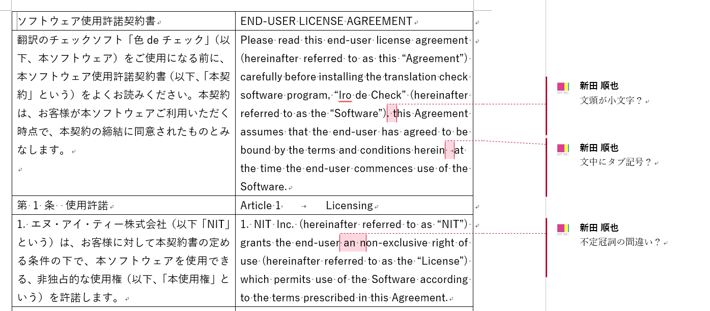JTFのスタイルガイドに基づいて該当項目をマーキングしたりコメントを挿入したりできます。