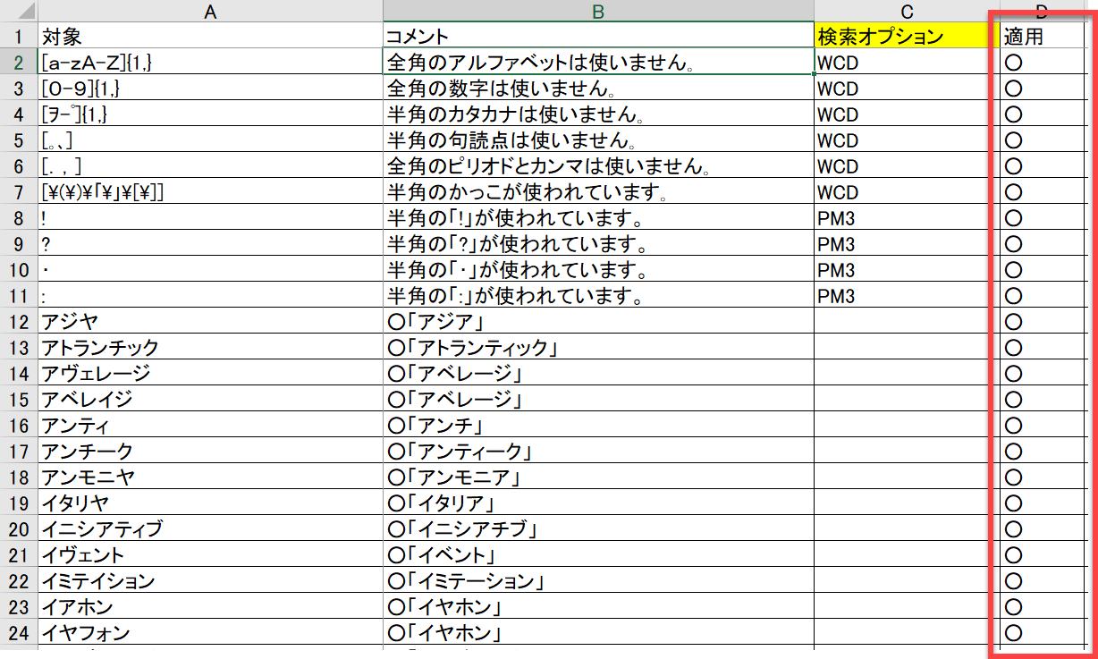 このうち、使う項目については、D列の適用を「〇」にすればチェックできるようになります。