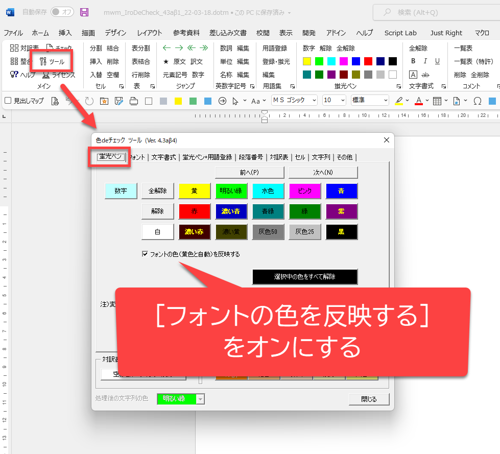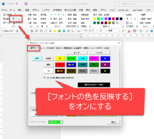 [ツール]ダイアログの[蛍光ペン]タブの[フォントの色を反映する]チェックをオンにします。