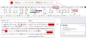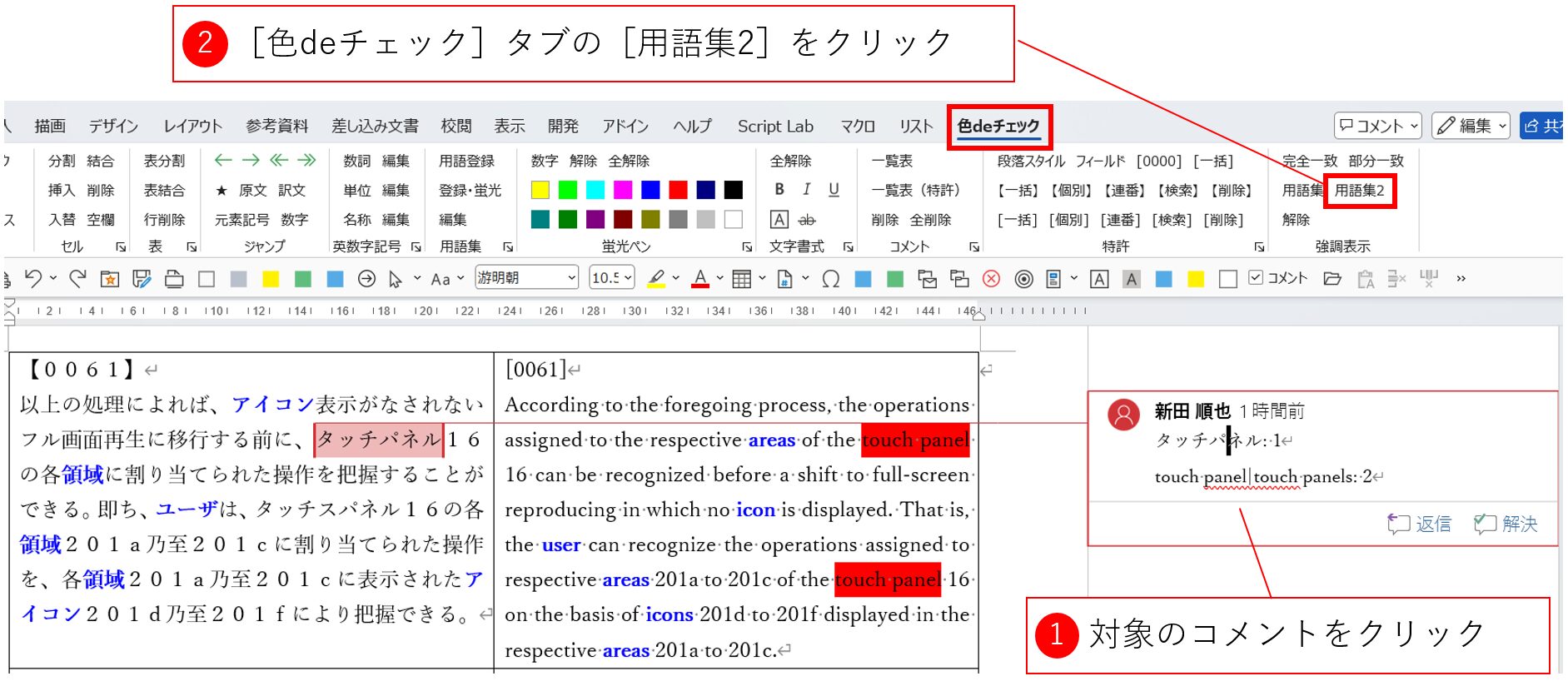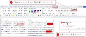 これまでと同様に、対象のコメントをクリックしてから[色deチェック]タブ[用語集2]ボタンをクリックします。