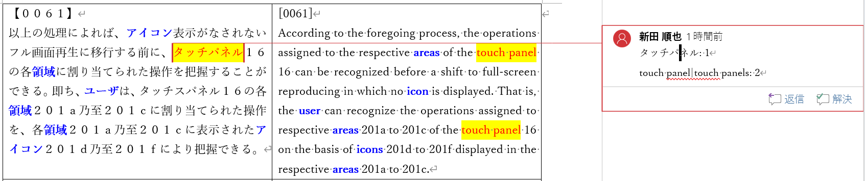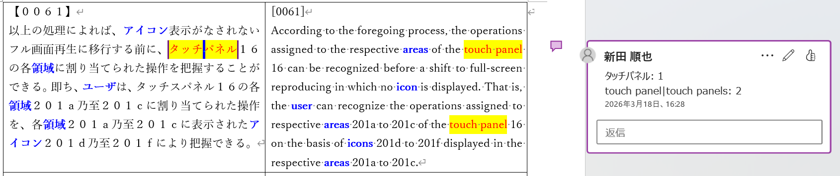 すると、このコメントに表示されている用語が原文と訳文とで強調表示されます。タッチパネルの1か所とtouch panelの2か所が強調表示されていますので、内容の確認に役立ちます。