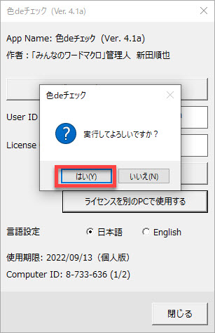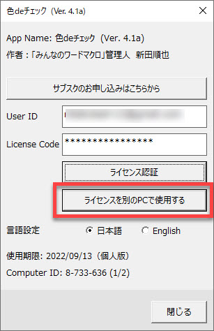 このパソコンで色deチェックを利用する場合には、他のPCで利用されていないユーザーIDとライセンスコードを登録すれば利用できるようになります。