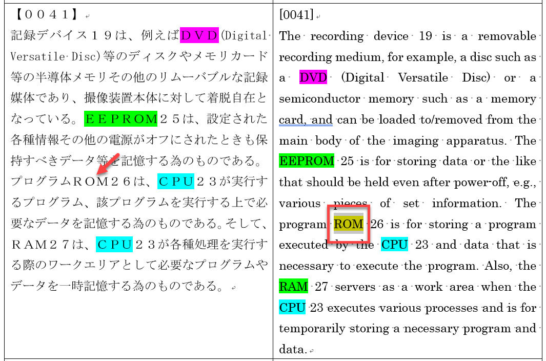逆に、英文中の半角表記の「ROM」を選択して黄色に着色すると、以下のように和文中の全角表記の「ROM」(赤矢印箇所)は着色されないのです。