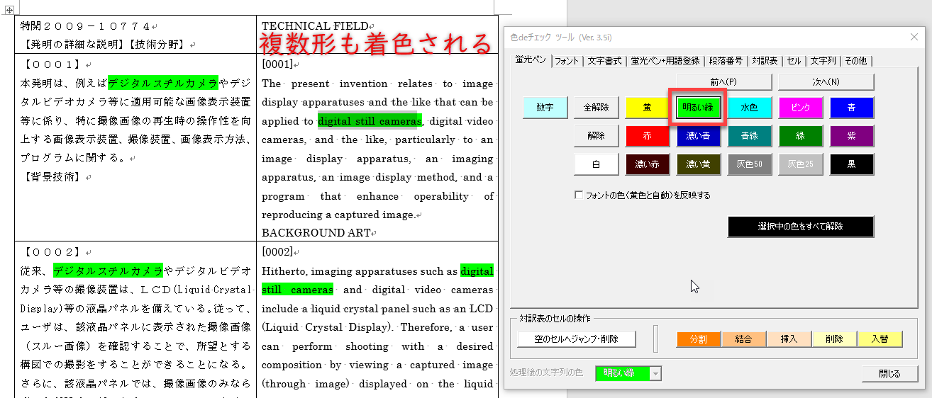 まずは原文のキーワード(デジタルスチルカメラ)を選択し、ダイアログの[明るい緑]ボタンをクリックして着色します。