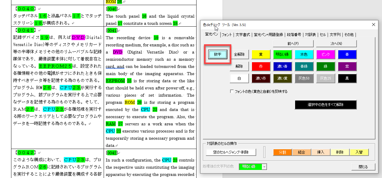 原文と訳文とに共通して記載されているという意味では、数字もアルファベットと同じです。数字を着色するための[数字]ボタンを用意しましたのでこちらをご利用ください。
