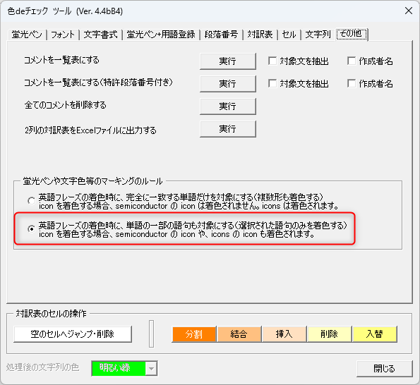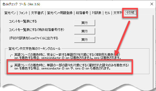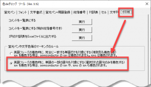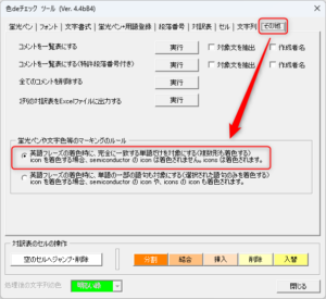 このように、和文中のアルファベットの着色ができなくない場合には、[ツール]ダイアログの[その他]タブの[マーキングのルール]の項目で、以下のように設定してください。