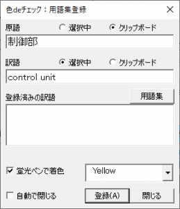 ラジオボタンを操作して、原語欄に選択中の「control unit」を表示してもいいです。これは好みで設定をしてください。