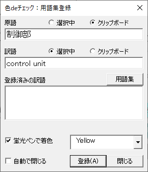 すると、以下のダイアログが表示されます。原語欄には、クリップボードに登録された用語の「制御部」が表示され、訳語欄には、選択中の「control unit」が表示されています。