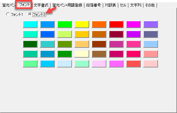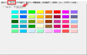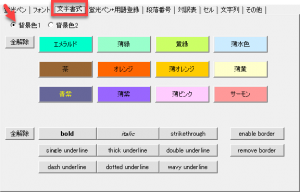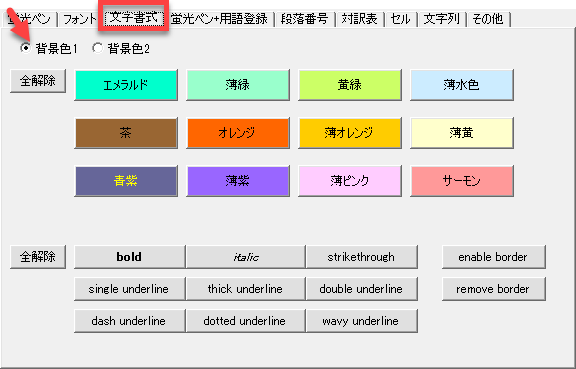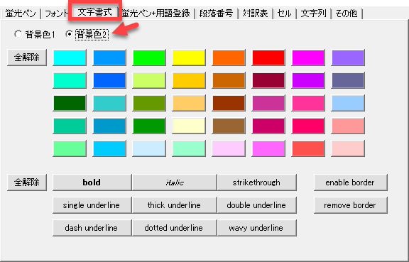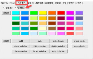 [文字書式]タブでは、背景色の選択画面を2種類表示できます。下線などの文字書式もマーキングに選択できます。