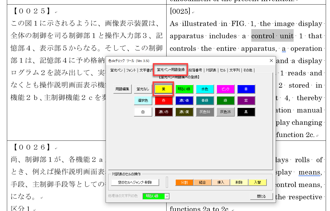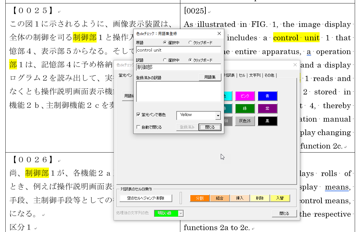 原語と訳語を決めたら、[登録]ボタンをクリックすると、原語と訳語が黄色に着色されて、この用語のペアが用語集ファイルに登録されます。