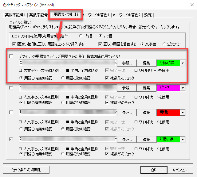 用語の登録先は、チェックの[オプション]ダイアログの[用語集での比較]タブにあるデフォルトの用語集ファイルです。