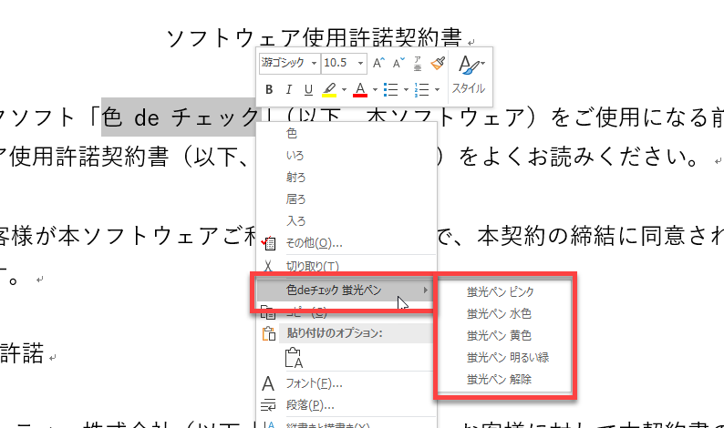 右クリックメニューにも4色だけですが蛍光ペンの着色項目が表示されます。マウスで項目を選択してすぐに着色できるので便利です。