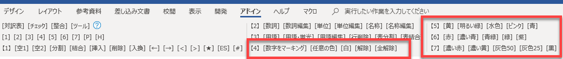 [アドイン]タブにある【4】から【7】のツールバー(ボタン群)のボタンが蛍光ペンの着色機能に対応しています。