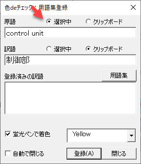 考え方としては、「クリップボードに保存した語句」と「選択されている語句」をペアにして用語集に登録するのです。そして、登録するのと同時に蛍光ペンで両方の語句を着色します。