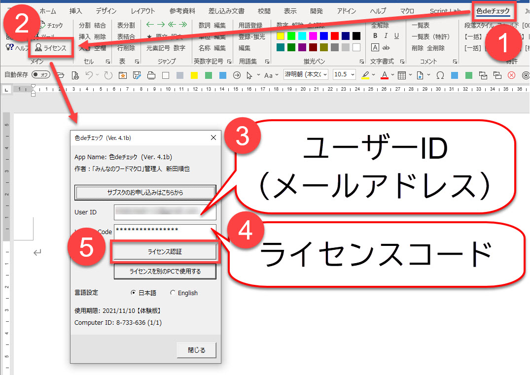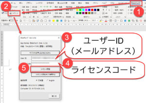 ①[色deチェック]タブの②[ライセンス]ボタンをクリックして以下のダイアログを開き③ユーザーIDと④ライセンスコードを入力し、⑤[ライセンス認証]ボタンをクリックして登録します。