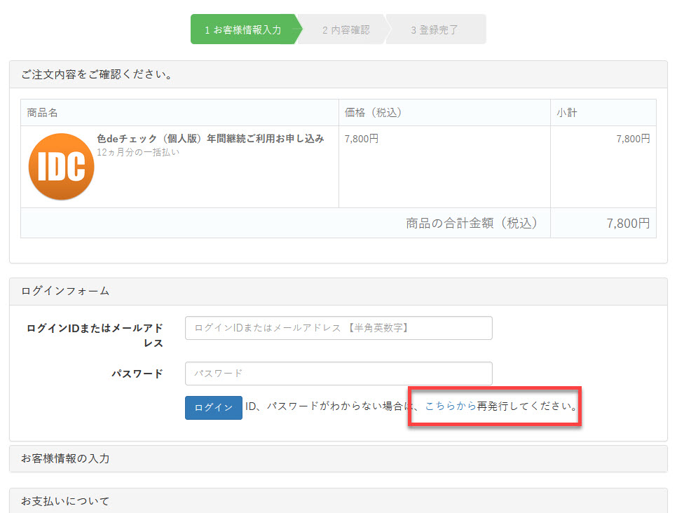 赤矢印の位置に現在ご利用中の色deチェックのライセンスが表示され、今回のお申込みで有効期限がいつまで延長されるのか表示されます。