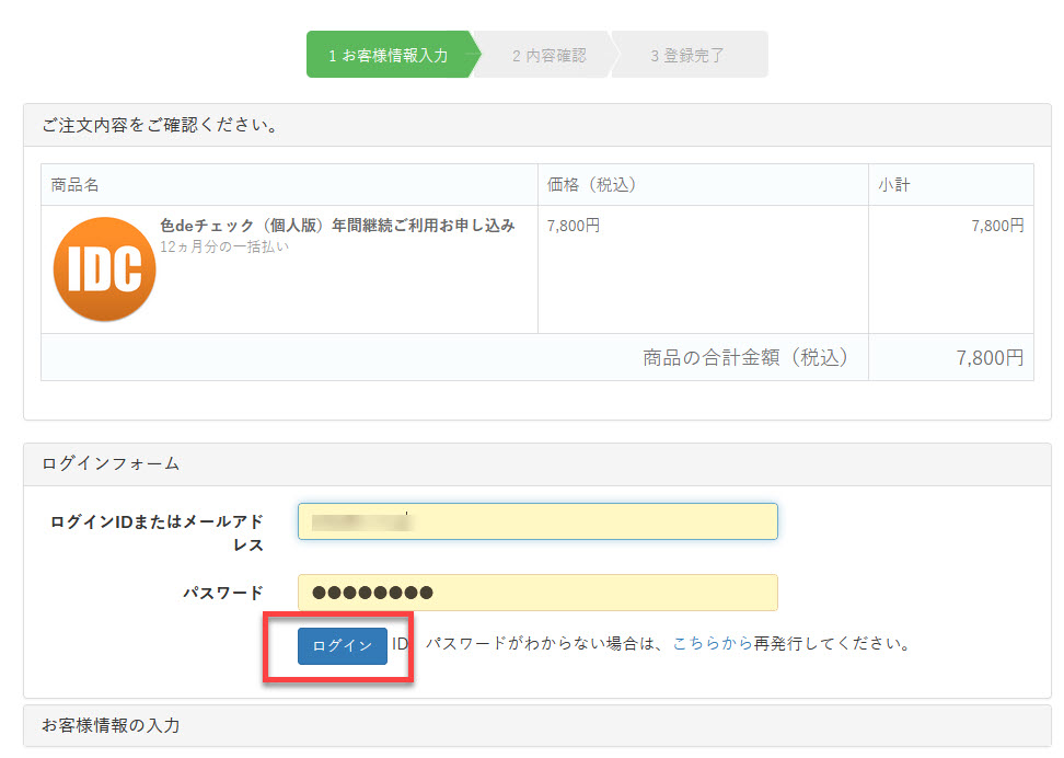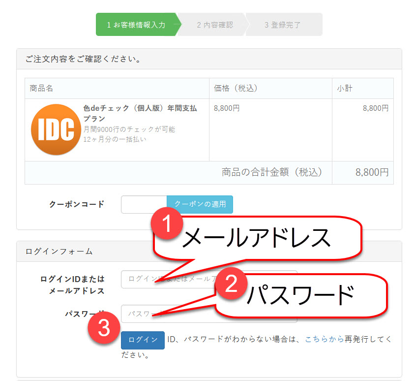 以下のログインフォームが表示されます。更新案内時に色deチェックをご利用時に登録いただいたメールアドレス宛に、ログイン用のパスワードをご案内します。