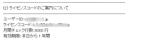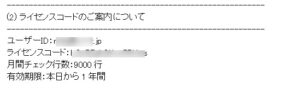 以下のように、ユーザーID(ご登録いただいたメールアドレス)とラインセンスコードがメールで送られます。